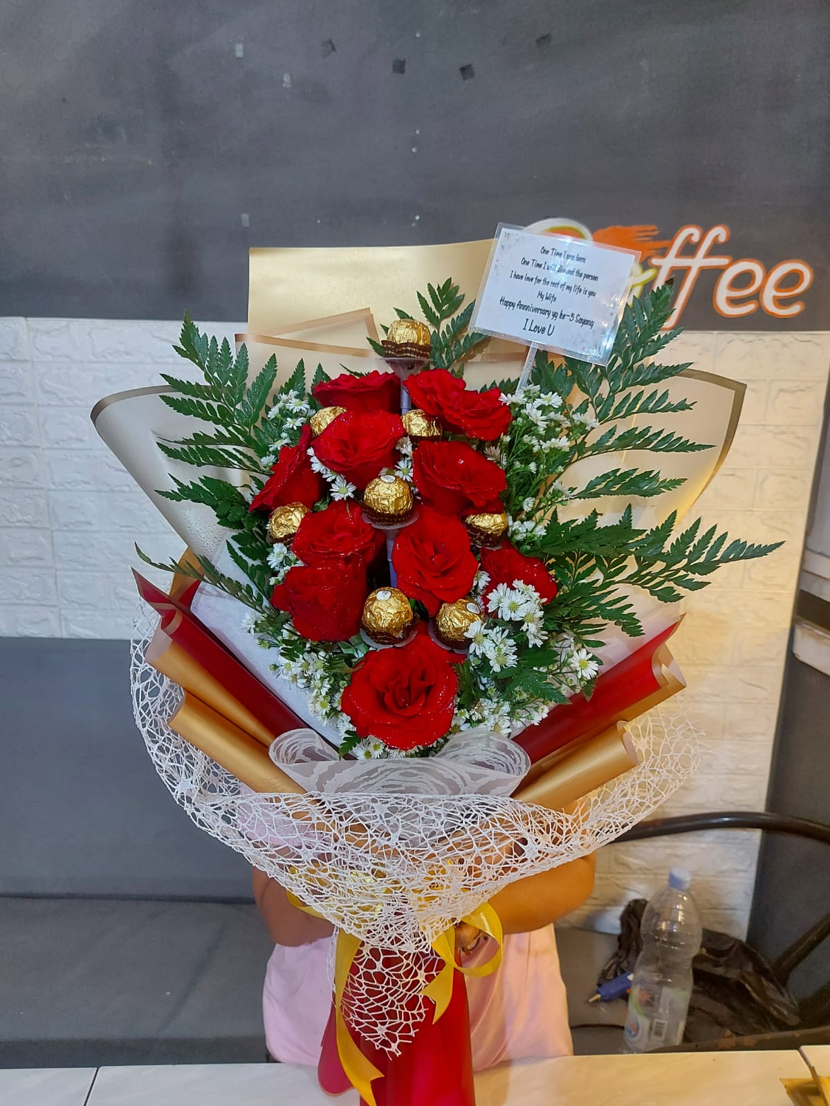 Dihiasi dengan dedaunan hijau segar, bouquet ini tidak hanya memberikan kesan mewah, tetapi juga menghadirkan suasana yang hangat dan penuh kasih. Dibungkus dengan kertas premium dan pita cantik, buket ini cocok untuk berbagai momen istimewa, seperti perayaan ulang tahun, pernikahan, atau sekadar ungkapan kasih sayang.