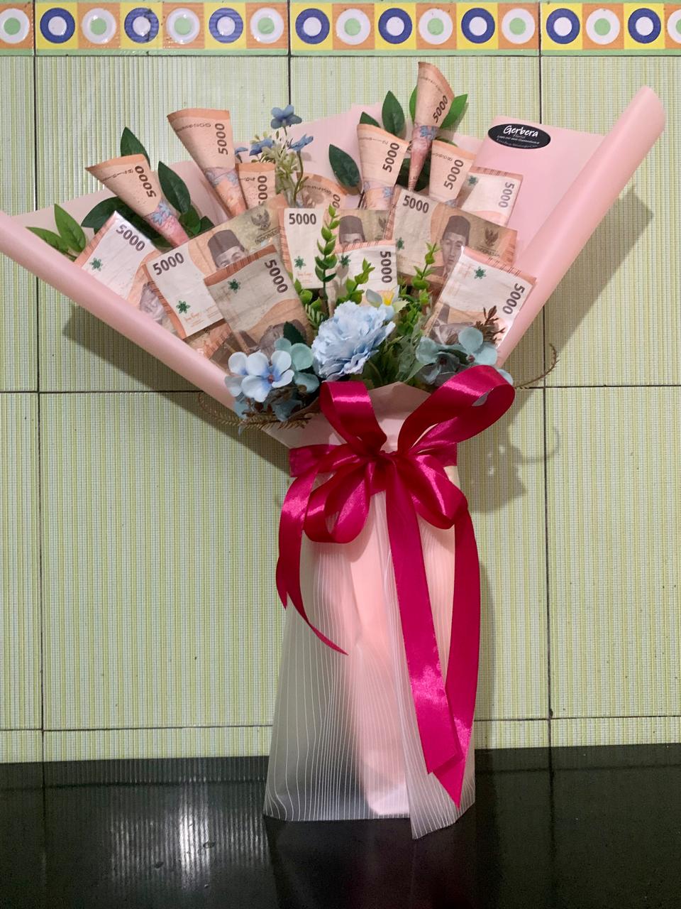 Bouquet uang dengan nominal Rp75.000 yang terdiri dari pecahan Rp5.000 ini merupakan hadiah unik dan berkesan. Dibuat dengan susunan rapi, setiap lembar uang disusun menyerupai kelopak bunga, dipadukan dengan dekorasi elegan seperti kertas wrapping premium, pita, dan ornamen tambahan seperti bunga kering atau dedaunan sintetis. Cocok untuk hadiah ulang tahun, wisuda, atau apresiasi spesial lainnya, bouquet ini tidak hanya bernilai estetika tetapi juga fungsional, memberikan kejutan manis bagi penerimanya.